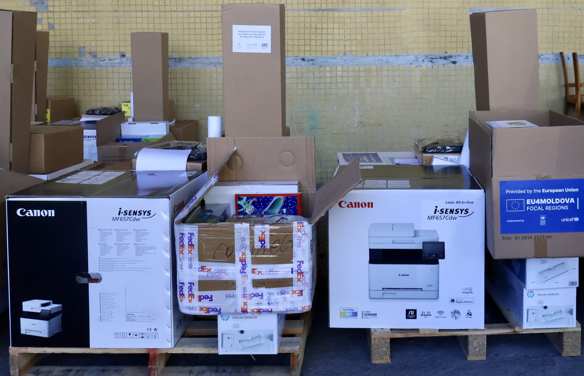 În raioanele Cahul și Ungheni, sprijinul a venit prin programul EU4Moldova: Regiuni-cheie, implementat de UNICEF și PNUD – cu un total de aproximativ 500 de seturi de echipamente distribuite.
