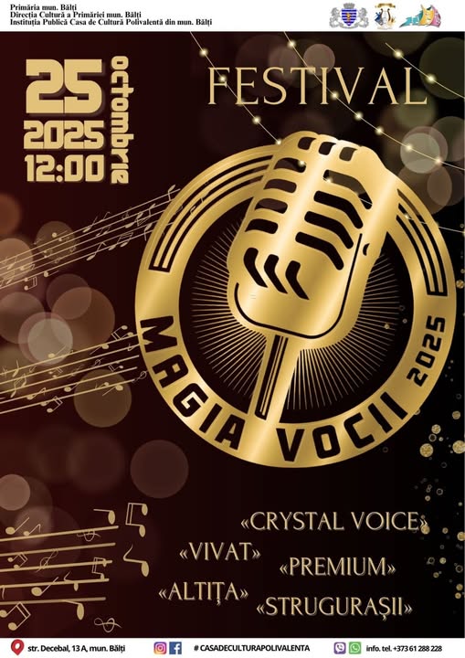 Primăria municipiului Bălți invită toți iubitorii de muzică la o nouă ediție a Festivalului „Magia Vocii 2025”, care va avea loc sâmbătă, 25 octombrie, ora 12:00, la Casa de Cultură Polivalentă.
