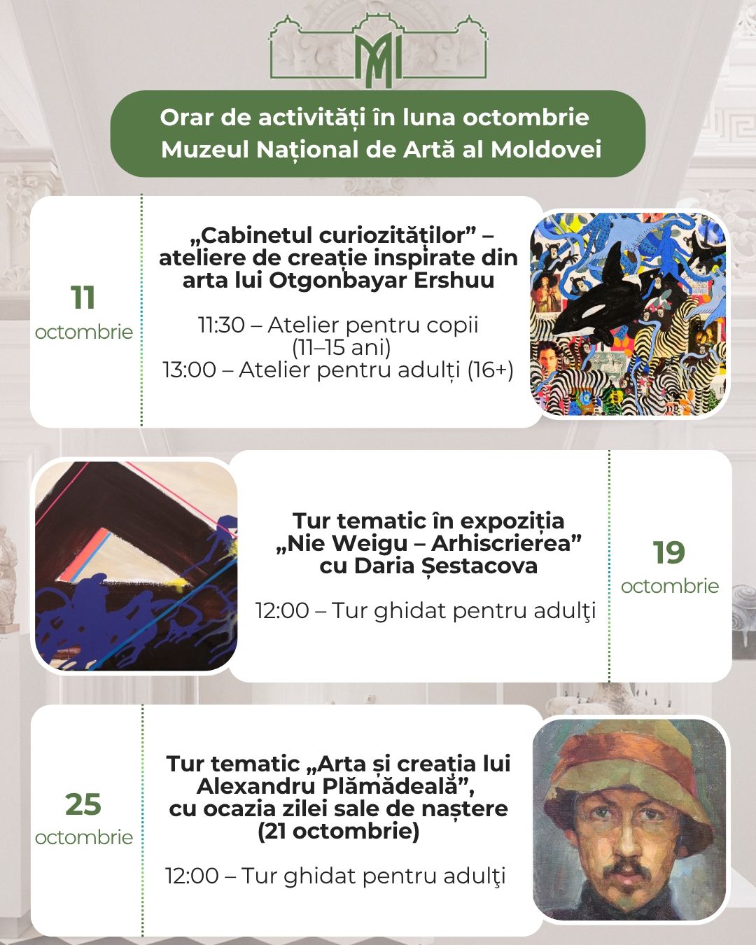 11 octombrie (sâmbătă) – „Cabinetul curiozităților” – ateliere de creație meditative inspirate din lucrările artistului mongol Otgonbayar Ershuu. Participanții vor explora expoziția personală a artistului și vor crea o lucrare unică, într-un proces meditativ bazat pe culori și timbre poștale. Cei interesați sunt încurajați să aducă propriile timbre pentru a le integra în lucrare.